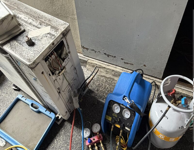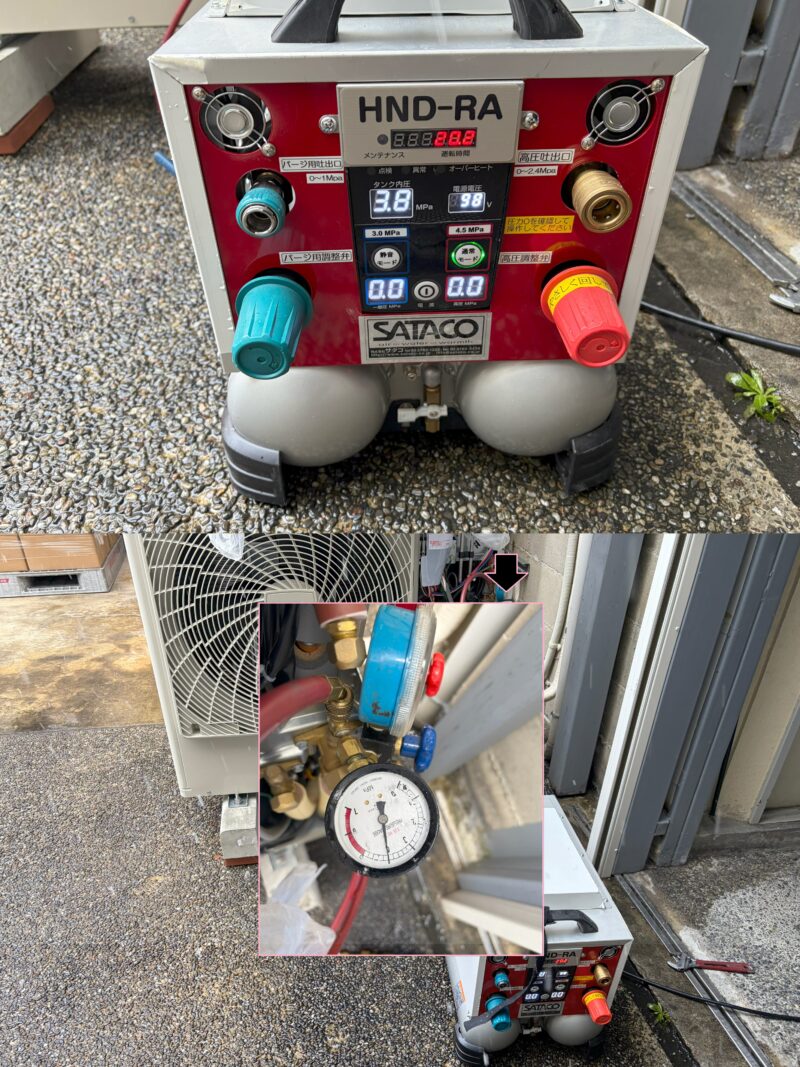 市内 工場 天カセエアコン入れ替え 2026.01.25 エリア 京都市内 ダイキン天井カセット形エアコン 更新工事 3馬力エアコンより6馬力への馬力アップにて更新しました 室外機の設置場所変更 既設室外機が大きくなるのと、メンテができなくなる為 室外機の設置場所の変更です 室内機撤去画像 機密試験 窒素発生機にて気密試験です 4Mpa フロンガス回収 ポンプダウン後撤去した 機器のフロンガス回収です