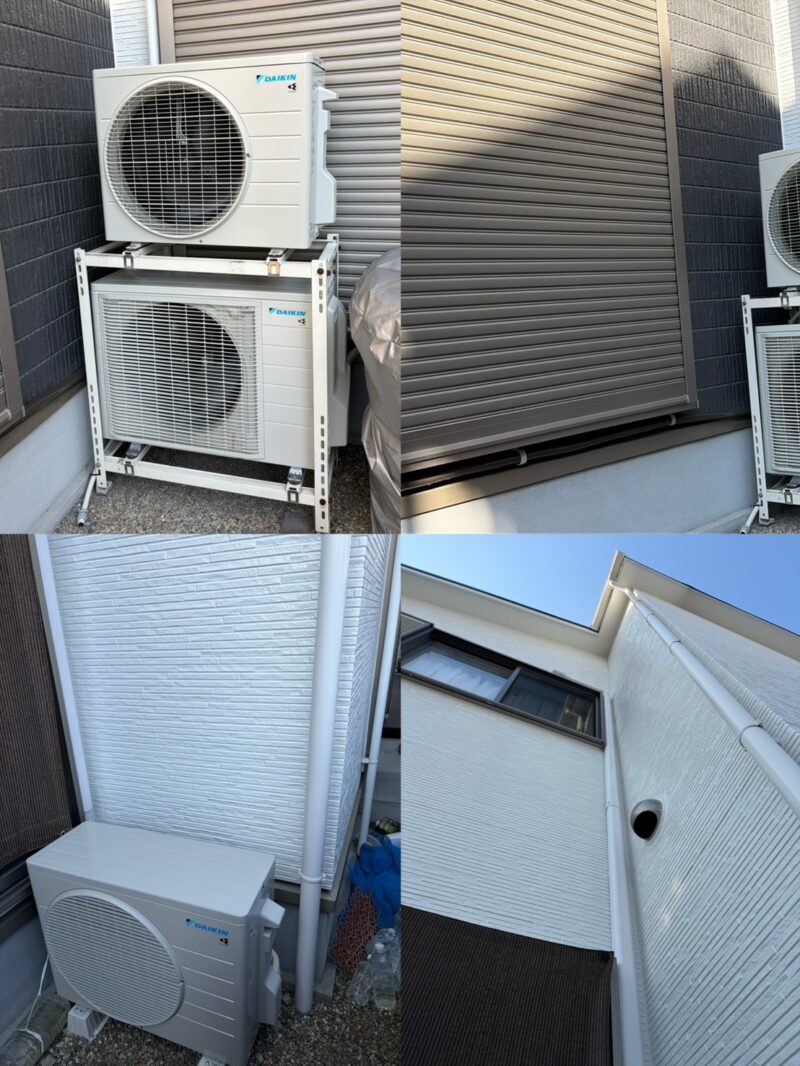 ∞長岡京市 お客様∞ 2026.02.05 エリア 長岡京市 参考費用 120,000円(税込) ルームエアコン 3台更新工事 本日お伺い致しました。お客様宅 1F 2台 ・ 2F 1台 1F配管ルートそのまま2F配管ルートを変更して化粧ダクトでの工事 でした。2F貫通穴あけ、コンセント移設の工事でした ∞室外機∞