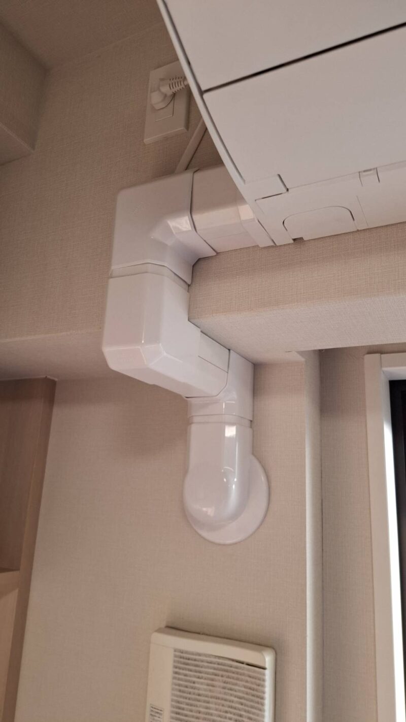 室内化粧ダクト 施工 2026.02.09 エリア 京都市 室内の化粧ダクト (MD85)施工作業 本体7.1KWの換気機能付きのエアコンの施工です 配管サイズも大きく、換気ホースもありましたので イナバ製 MD85 というサイズの化粧ダクトを使用しての 施工となりました。